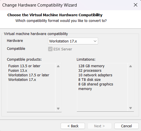 VM->Manager->Change Hardware Compatibility 설정에 들어간다.